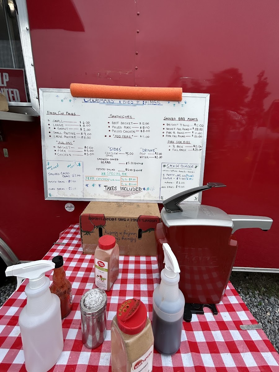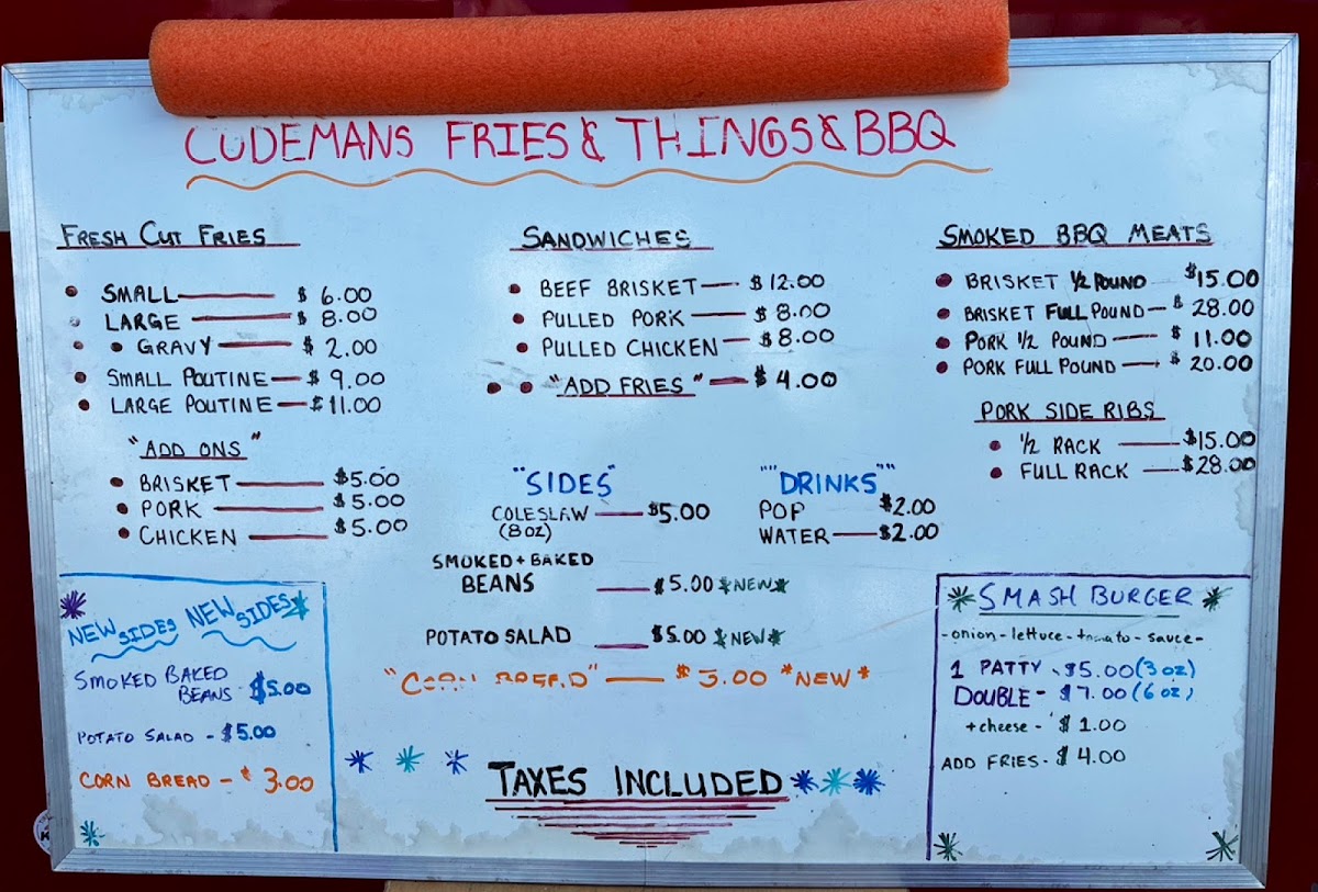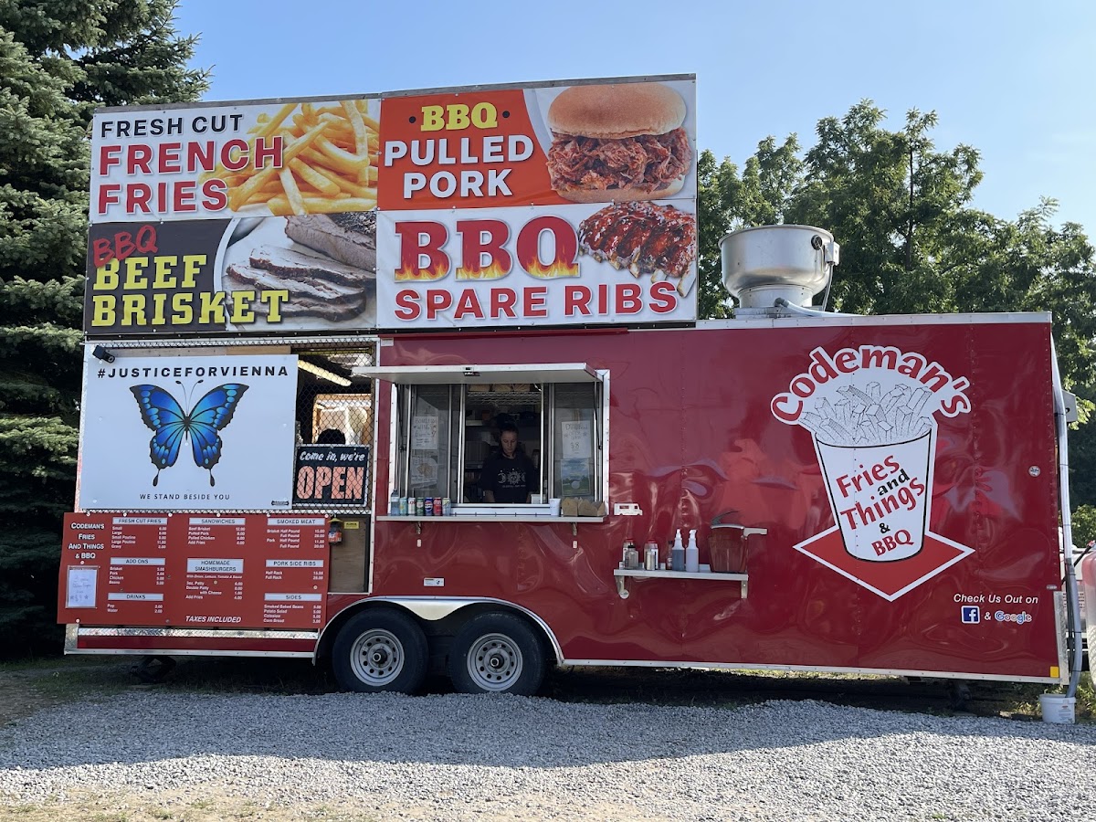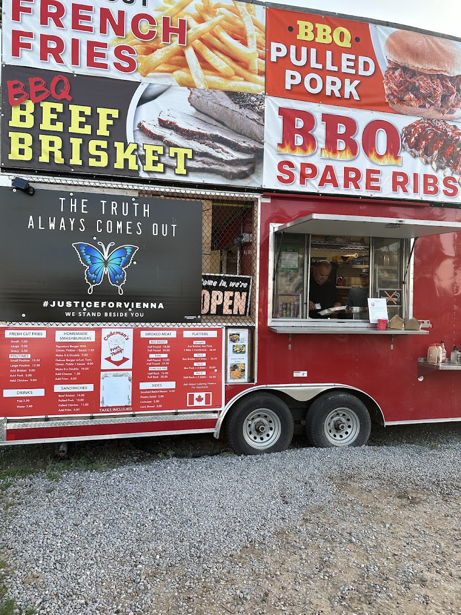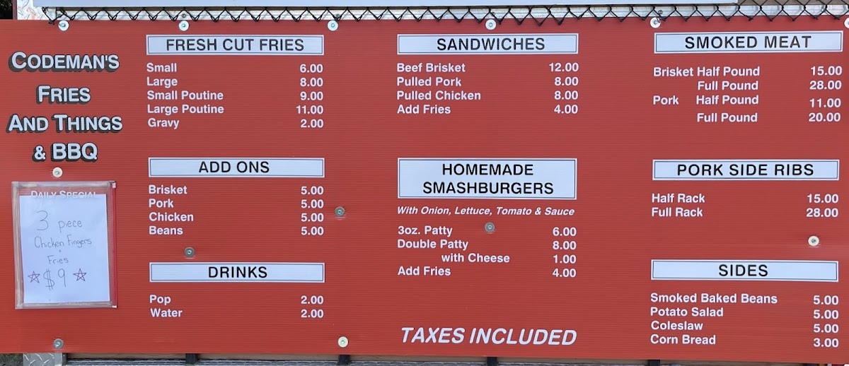 At Codemans Fries & Things & BBQ & Catering, the menu offers a great mix of classic comfort food and flavorful BBQ dishes. Their Fresh Cut Fries are available in small or large portions, with an option to add gravy. For those craving a hearty, indulgent meal, the Poutines come in both small and large sizes, offering a deliciously rich and satisfying option. The Homemade Smashburgers are a must-try, with choices like the Signature Burger with onion, pickles, and sauce, or the more loaded Deluxe Burger featuring lettuce, tomato, onion, pickle, and sauce. For a refreshing drink, they offer Pop or Water. The sandwich section includes tender options like Beef Brisket, Pulled Pork, and Pulled Chicken. If you’re in the mood for smoked meats, you can opt for a Half Pound Beef Brisket or Pork, or indulge in a Full Pound Beef Brisket or Pork. For those looking for a full BBQ experience, the Smoked Meat options also include Half Rack Pork Side Ribs. As sides, you can enjoy flavorful Smoked Baked Beans, Potato Salad, Coleslaw, and Cornbread. To top it off, the Platters include generous portions like the Sampler with 4oz brisket, 4oz pork, 2 ribs, and cornbread, or the 8oz Brisket or Pork Platters, served with 2 sides. Whether you’re in the mood for something quick or a full, satisfying meal, Codemans offers an array of choices that deliver on flavor and portion size.